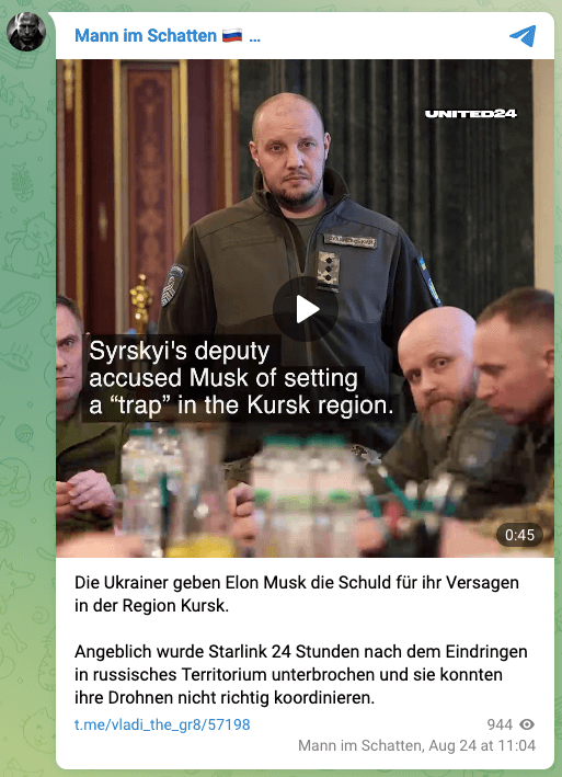 Im Netz verbreitet sich in diesem Kontext ein Video: Elon Musk habe den Starlink-Satellitendienst seiner Firma SpaceX, den das ukrainische Militär für Kommunikation und Drohnenangriffe nutzt, einen Tag nach Beginn der Offensive abgeschaltet. Oben rechts im Video ist das Logo der staatlichen ukrainischen Fundraising-Plattform „United 24“ zu sehen.