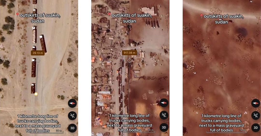 In einem der Tiktok-Videos sind Koordinaten des Geländesangegeben. Sie führen auf Google Earth zu denselben Bildern (siehe Collage unten). Dort steht aber auch: Die Satellitenaufnahmen sind vom 8. April 2025, wurden also lange vor den Berichten über die Al-Fashir-Massaker aufgenommen – und zwar knapp 2.000 Kilometer entfernt von Al-Fashir. Sie zeigen das Umland der Hafenstadt Sawakin am Roten Meer, im Osten des Sudans.
