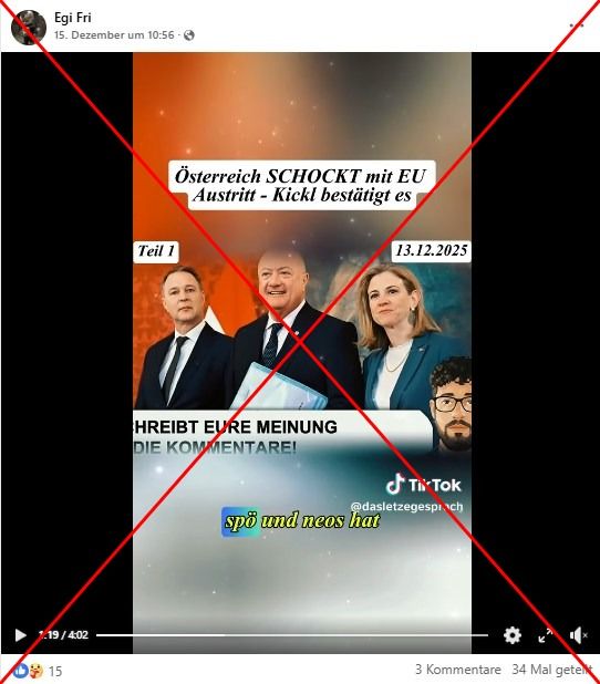 „Österreich schockt die EU“, heißt es in einem Video, das seit Mitte Dezember 2025 in sozialen Medien kursiert und auf Facebook vielfach geteilt wurde. „Kickl bestätigt Austritt“, lautet die angeblich schockierende Meldung, die mit 13. Dezember 2025 datiert ist. Österreich stehe „kurz davor, den eisernen Griff Brüssels endgültig abzustreifen“. Knapp vier Minuten dauert der Clip, wonach der vermeintliche Austritt angeblich „dank“ US-Präsident Donald Trump ins Rollen gebracht worden sein soll. „Die EU-Führung steht kurz vor dem totalen Nervenzusammenbruch“, sagt eine männliche Stimme weiter. Zudem erwähnt der Beitrag eine Umfrage, wonach die österreichische Bevölkerung die Regierung nicht unterstützen würde.
