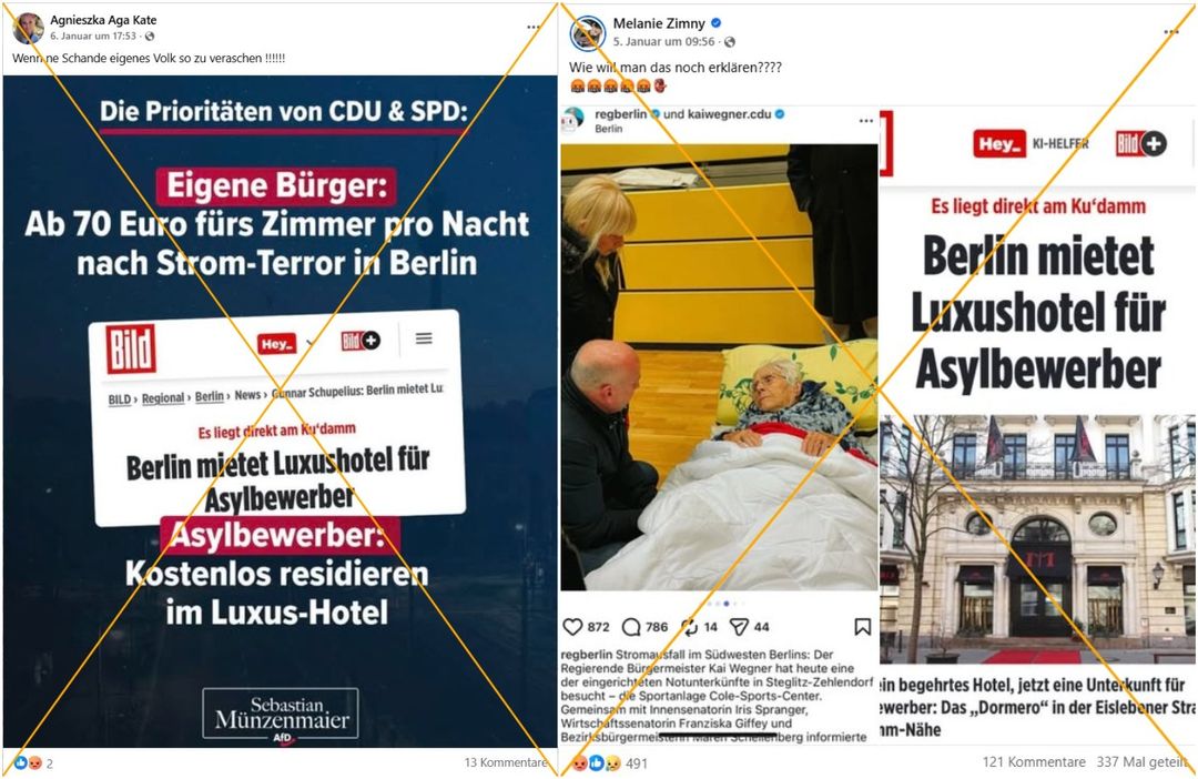 Nach einem Brandanschlag im Südwesten Berlins Anfang Januar 2026 waren rund 45.000 Haushalte tagelang ohne Strom. In diesem Zusammenhang führten Userinnen und User sozialer Plattformen mit einer Behauptung in die Irre, dass Asylbewerberinnen und -bewerber in einem Luxushotel am Kurfürstendamm untergebracht wurden, während deutsche Staatsangehörige in Turnhallen schlafen oder sich teure Hotels hätten leisten müssen. Dabei waren betroffene Geflüchtete in einer Notunterkunft oder bei Bekannten untergebracht, wie zuständige Behörden bestätigten. Das besagte Luxushotel bezeichnete die Behauptungen ebenfalls als „unzutreffend“.