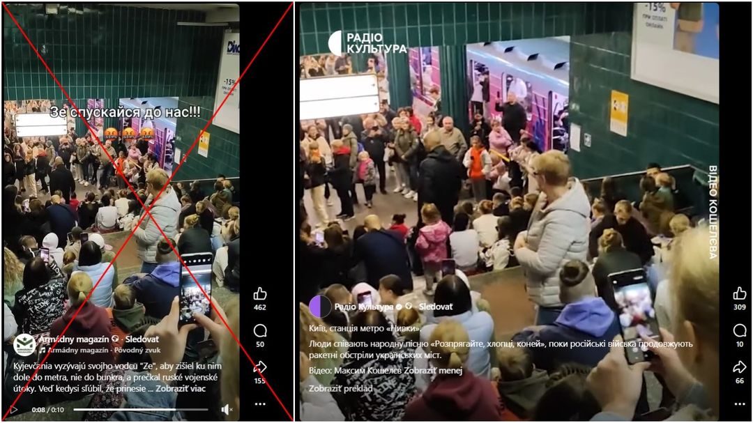 Eine umgekehrte Bildsuche nach Ausschnitten des Videos führte zu einem Facebook-Beitrag des Senders Radio Culture vom 10. Oktober 2022, der dem ukrainischen öffentlich-rechtlichen Rundfunk angehört. Der Beitrag, der einen 27-sekündigen Ausschnitt aus einer U-Bahn-Station zeigt, enthält die folgende Beschreibung: „U-Bahn-Station ‚Nyvky‘ in Kiew. Die Menschen singen das Volkslied ‚Spannt eure Pferde aus, Jungs‘, während russische Truppen weiterhin ukrainische Städte mit Raketen bombardieren.“