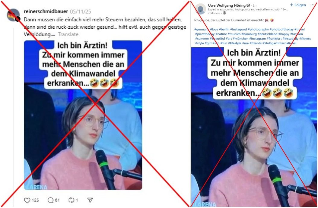 „Chef, ich kann heute nicht zur Arbeit kommen, hab Klimawandel“, scherzten mehrere Userinnen und User auf Facebook. Dazu kursierte etwa am 4. August 2025 ein Bild einer Frau mit kurzem Haarschnitt, die einen rosa Pullover sowie eine Brille trägt. Vor ihr befindet sich ein Mikro. Sie scheint in einem Fernsehstudio zu sitzen. „Ich bin Ärztin“, ist auf dem Sharepic zu lesen, „zu mir kommen immer mehr Menschen die an dem Klimawandel erkranken“.
