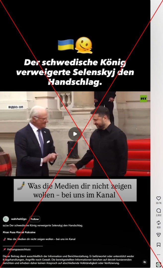 Das schwedische Königshaus dementierte die Falschbehauptung, wonach der schwedische König Selenskyj nicht mit einem Händedruck gewürdigt habe, gegenüber dem schwedischen öffentlich-rechtlichen Fernsehsender SVT am 18. April 2026. Im Bericht wird ein X-Beitrag des russischen Staatssenders Russia Today (RT) erwähnt. AFP konnte das konkrete Video nicht ausfindig machen, da RT in der EU gesperrt ist – dessen Logo ist jedoch in den geteilten Videos zu sehen. Es sei „falsch und hässlich“, dass Russland das Treffen so beschreibe. Selenskyj und der König hätten sich im Zusammenhang mit der Sequenz im Clip mehrfach die Hand geschüttelt, zitierte SVT eine Sprecherin des Königshauses. Dieses veröffentlichte zuvor ein Bild, auf dem der Monarch und der Präsident händeschüttelnd in die Kamera lächeln.