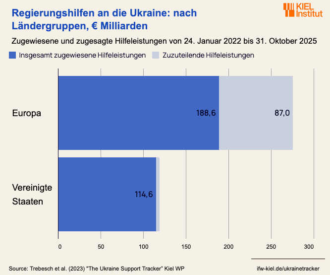 Der Tracker erfasst militärische, finanzielle und humanitäre Hilfsgelder, die der Ukraine direkt zugewiesen oder als Zusage vorgemerkt sind. „Zugewiesen“ bedeutet, dass die Gelder bereits ausgezahlt wurden oder zur Auszahlung vorgesehen sind, zum Beispiel in Form von Beschaffungsverträgen. Nicht berücksichtigt werden aber zum Beispiel Gelder, die zur Wiederauffüllung von US-Waffenbeständen verwendet wurden. Demnach wurden von den USA bis Ende Oktober 2025 insgesamt rund 114,6 Milliarden Euro, also rund 134,2 Milliarden US-Dollar zugewiesen.
