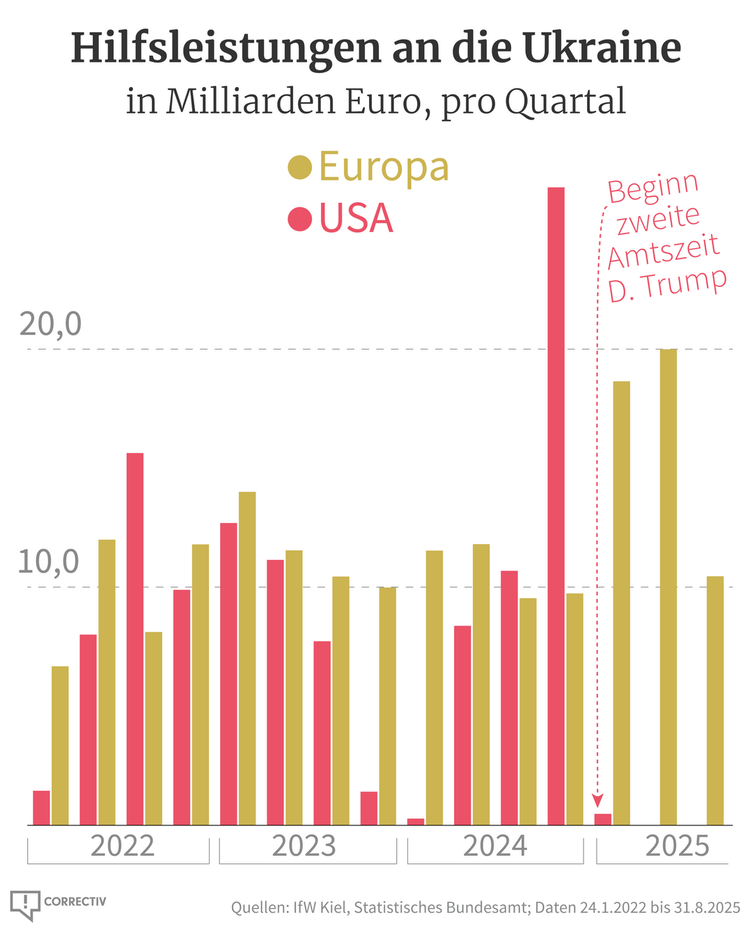 Daten des IfW zeigen auch, dass die Unterstützung durch die USA nach Trumps Antritt seiner zweiten Amtszeit 2025 komplett eingebrochen ist. Damit, dass die USA kein Geld mehr senden, hat Trump also vorerst größtenteils recht, allerdings könnte sich die Situation schon bald ändern.