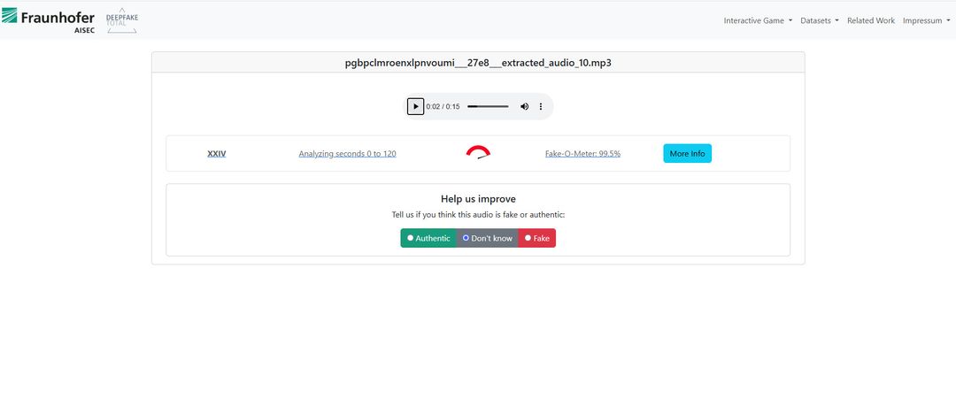 Eine weitere Untersuchung mit dem Audio-Analysetool Deepfake Total des Fraunhofer-Instituts für Angewandte und Integrierte Sicherheit ergab eine Wahrscheinlichkeit von 99,5 Prozent, dass die Tonspur mit KI erstellt wurde.