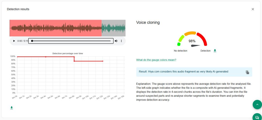 AFP analysierte die französischsprachige Audiospur des Videos, die auch in den deutschsprachigen Beiträgen zu hören ist, mit dem KI-Erkennungstool Hiya von InVID WeVerify, an dessen Entwicklung AFP beteiligt ist. Das Tool kam zu dem Ergebnis, dass die Tonspur mit einer Wahrscheinlichkeit von 98 Prozent KI-generiert ist.