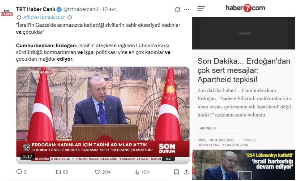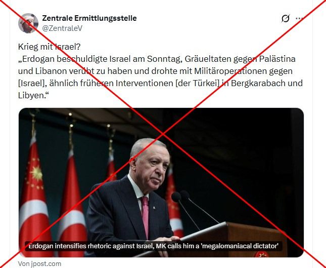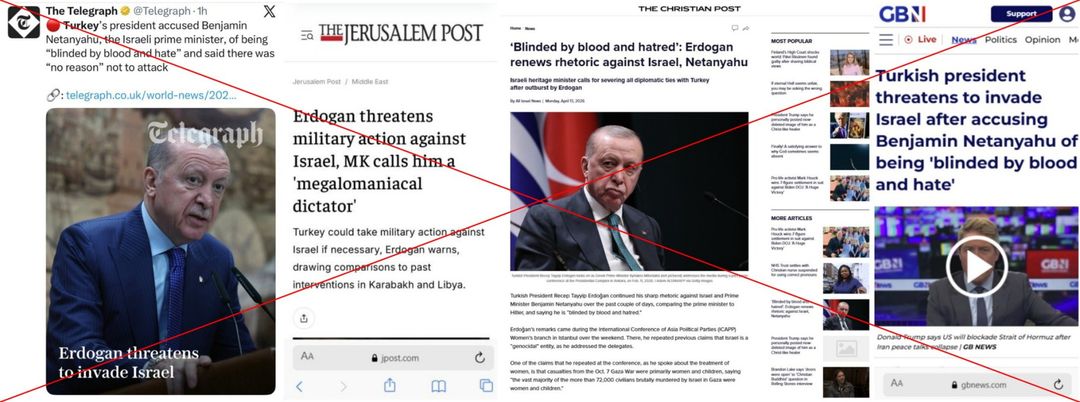 „Erdogan beschuldigte Israel am Sonntag, Gräueltaten gegen Palästina und Libanon verübt zu haben und drohte mit Militäroperationen gegen [Israel], ähnlich früheren Interventionen [der Türkei] in Bergkarabach und Libyen“, zitierte ein X-Nutzer am 14. April 2026 aus einem verlinkten Artikel der Zeitung „The Jerusalem Post“ angebliche Äußerungen des türkischen Präsidenten Recep Tayyip Erdogan vom April 2026. Auf Facebook und Telegram sowie in anderen Sprachen wie Arabisch, Englisch, Französisch und Spanisch wurden diese und ähnliche Behauptungen ebenfalls geteilt.