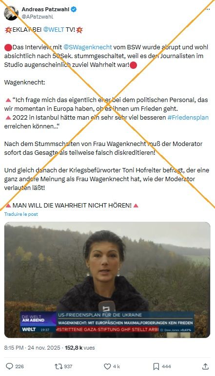 „EKLAT BEI @WELTTV! Das Interview mit @SWagenknecht vom BSW wurde abrupt und wohl absichtlich nach 50Sek. stummgeschaltet, weil es den Journalisten im Studio augenscheinlich zuviel Wahrheit war“, schrieb ein User am 24. November 2025 auf X und teilte ein rund zweiminütiges Video. Dabei handelt es sich um einen Clip von Welt TV, der Sender der Zeitung „Welt“, in dem eine Moderatorin Aussagen der Politikerin Sahra Wagenknecht (BSW) über den US-Plan zur Beendigung der Kämpfe in der Ukraine ankündigt. „Noch vor zwei oder drei Jahren, also beispielsweise in Istanbul, hätte man einen sehr sehr viel besseren Friedensplan erreichen können“, sagt Wagenknecht in dem daraufhin zu sehenden Interview. Damals hätte die Ukraine keine Gebiete abtreten müssen, führt sie aus. Der aktuelle Plan sei jedoch „deutlich differenzierter“ als vielfach behauptet. Immerhin wären 100 Milliarden US-Dollar aus dem russischen Vermögen für den Aufbau der Ukraine verfügbar, so die Politikerin.