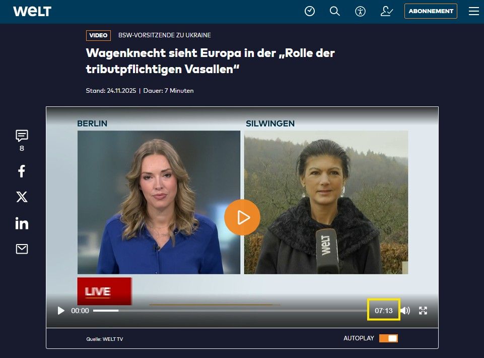 Der online geteilte Clip mit Wagenknecht ist jedoch lediglich ein Ausschnitt aus einem zuvor ausgestrahlten Live-Interview vom 24. November 2025. Das vollständige Interview ist unter anderem auf Youtube sowie auf der Website von Welt TV in voller Länge abrufbar (hier und hier archiviert). Es dauert insgesamt rund sieben Minuten. Nach jenem Satz, nach dem Wagenknecht laut den Online-Behauptungen „stummgeschaltet“ wurde, geht das Interview noch über fünf Minuten weiter.